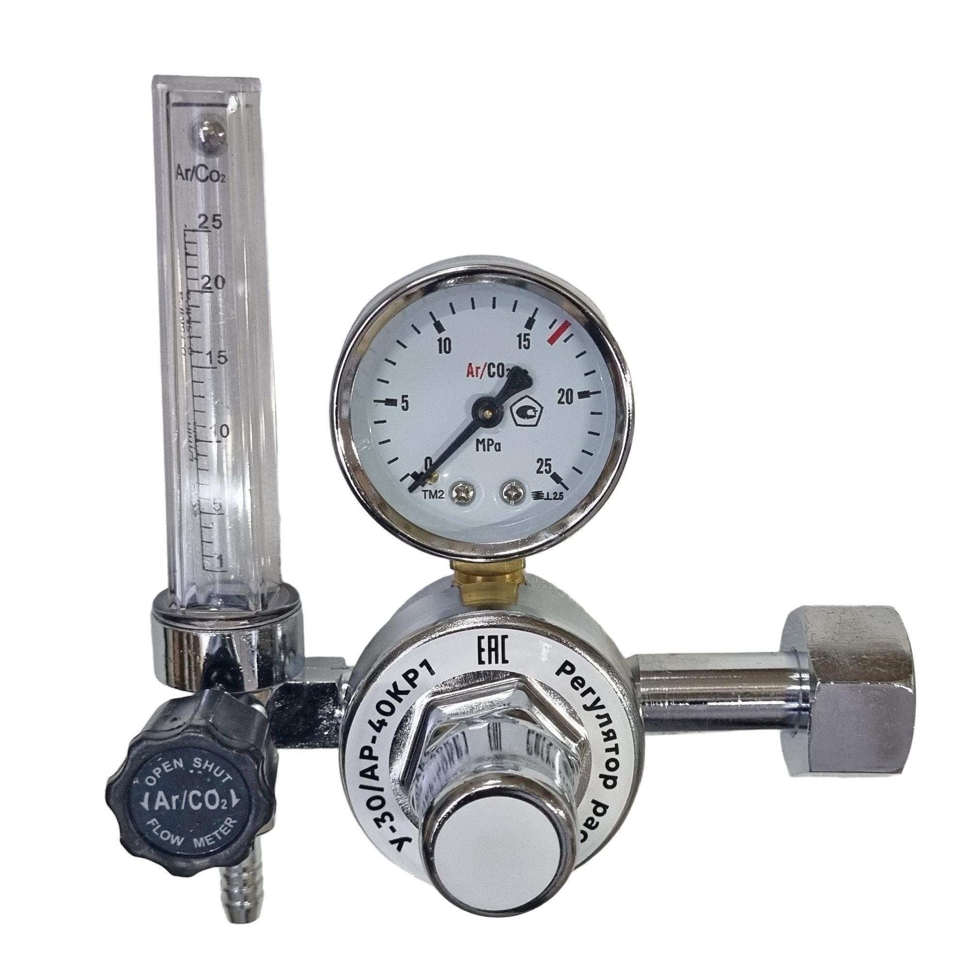 Регулятор универсальный У-30/АР-40-КР1-м (манометр+расходомер) SS — предназначен для понижения давления поступающего из баллона газа и автоматического поддержания постоянным заданного расхода при питании постов, установок в среде защитных газов, а также смежных процессов. Изготовлен из алюминия.