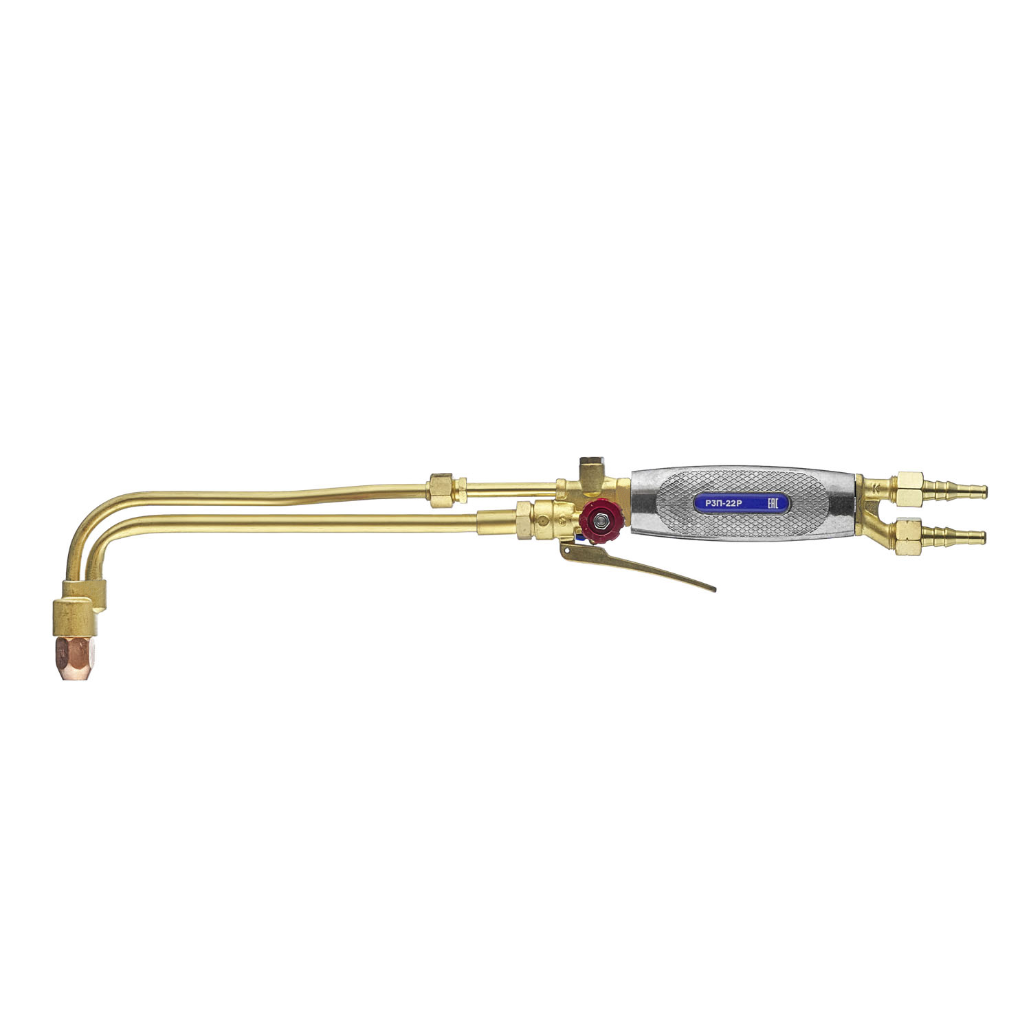 Резак с клапаном кислорода режущего (КР). Запорные вентили (кислород подогревающий и горючий газ) изготовлены из нержавеющей стали. На штоке вентилей установлен уплотнитель из фторопласта. Данная конструкция позволяет легко подтянуть сальниковую гайку, чтобы добиться необходимого плавного открытия вентилей.