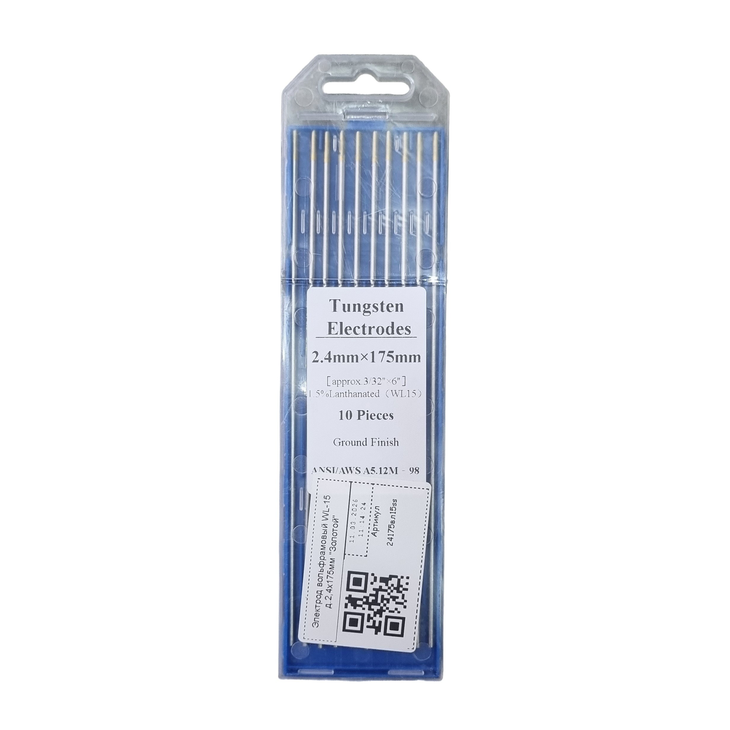 Электроды этой марки отличаются стабильностью, надежностью и просты в эксплуатации. Сплав вольфрама с оксидом лантана (1,5%) из которого состоят электроды дает быстрый и легкий первоначальный запуск дуги, устойчивую дугу и низкую склонность к прожигам. Лантановые электроды более долговечный по сравнению с чисто вольфрамовыми и меньше загрязняют сварной шов.Равномерное распределение оксида лантана по всей длине электрода позволяет сохранять первоначальную заточку электрода длительное время. Электроды WL-15 являются универсальными и подходят для сварки практически любых металлов.