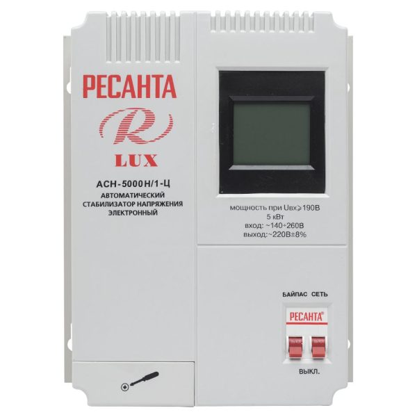 Стабилизатор АСН 5000 Н/1-Ц Ресанта Lux – релейного типа, предназначен для защиты бытовой техники от скачков напряжения в однофазных сетях 220 В. Он эффективно стабилизирует напряжение на входе в диапазоне от 140 до 260 В до целевого показателя 220 В с точностью ±8%. Данная модель поддерживает подключение суммарной мощности до 5 кВт (при 190 В) и выдерживает ток нагрузки до 26,3 А, поэтому она подходит для комплексной защиты мощной бытовой и офисной техники.