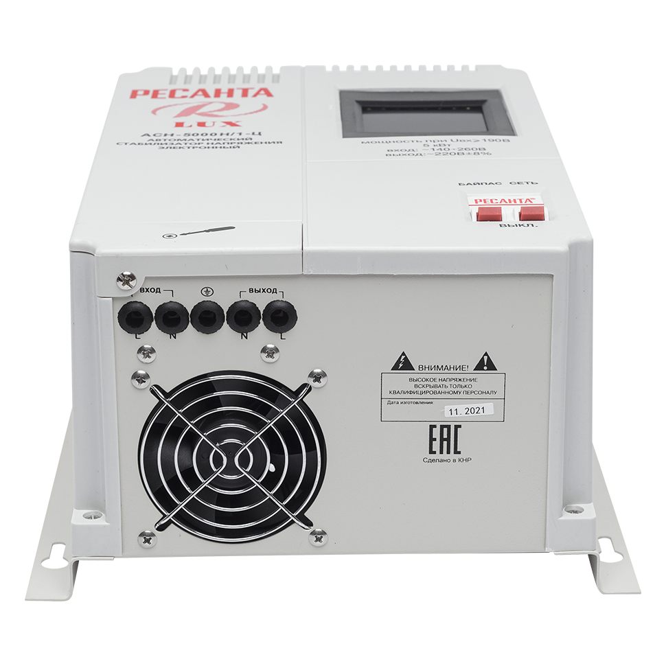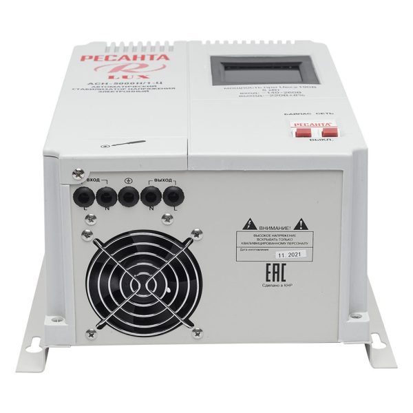 Прочный металлический корпус имеет класс защиты IP20, что гарантирует безопасную эксплуатацию в стандартных условиях. Благодаря настенному креплению стабилизатор можно компактно разместить в любом удобном месте. Охлаждение осуществляется за счет принудительной вентиляции, что позволяет устройству эффективно работать даже при высоких нагрузках. КПД стабилизатора достигает 97%, что минимизирует потери энергии. LCD-дисплей отображает все ключевые параметры работы: входное и выходное напряжение, уровень нагрузки, состояние защитных систем и обратный отсчет времени задержки включения.